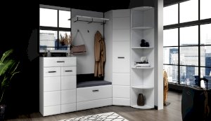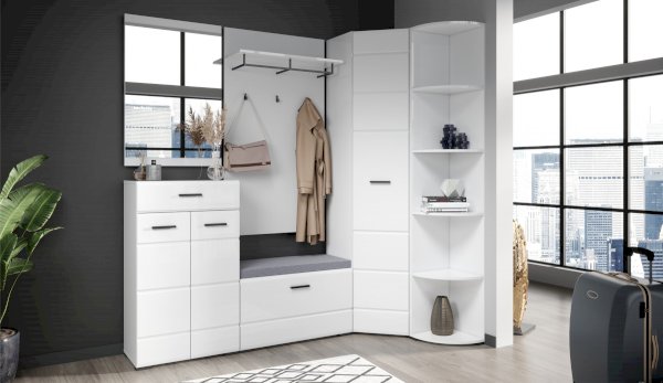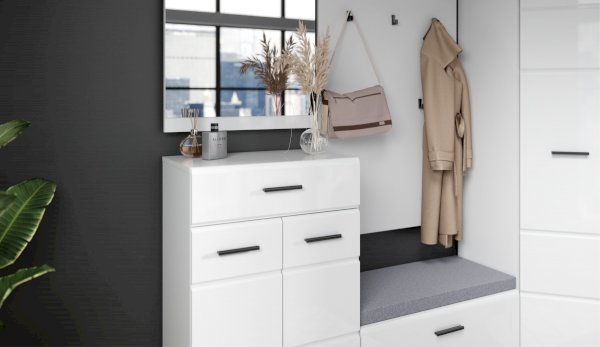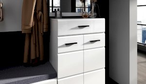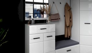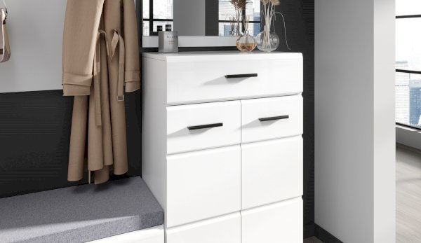 Комод Йорк сочетает в себе практичность и эффектный внешний вид. Глянцевые белые фасады High Gloss из МДФ наполняют помещение светом, делают его воздушнее. Тумба оснащена выдвижным ящиком на телескопических направляющих полного выдвижения для хранения необходимых мелочей. Отделение с распашными дверями укомплектовано вместительными полками для коробок с обувью или сумок. Идеально компонуется со всеми модулями системы Йорк.