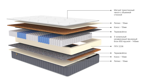 Наполнитель: Латекс, независимый пружинный блок, термовойлок, кокос, ППУ