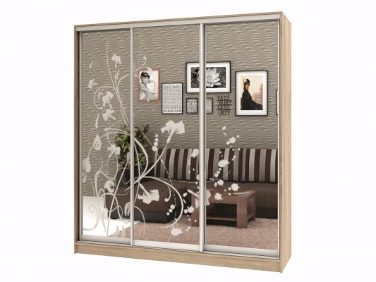 Данное изображение представлено в следующих цветах: корпус - Дуб Сонома, фасады - зеркало с пескоструйным рисунком, рамка двери и треки - Серебро матовое.