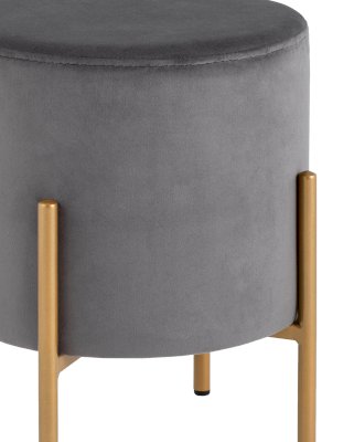 Стильный круглый пуф на металлических ножках. Мягкая обивка выполнена из износостойкого велюра, тактильно приятный и долговечный материал. Металлические ножки золотого цвета высотой 14,5 см выдерживают нагрузку до 80 кг. Подпятники в основании ножек делают пуф более устойчивым и предотвращают скольжение. Отличное дополнение в интерьер спальни, прихожей или зала.