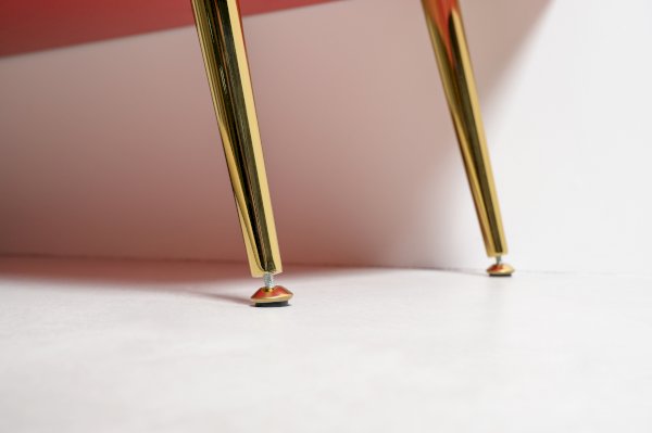 Лаконичная форма в сочетании с яркими теплыми цветами. Высокие опоры из металла обеспечивают визуальную легкость и удобство в уборке.