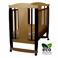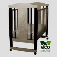 Кроватка декорирована фрезерным рисунком "Заяц с бантом". Уникальные фрезерные рисунки размером от 50 см на обеих спинках.